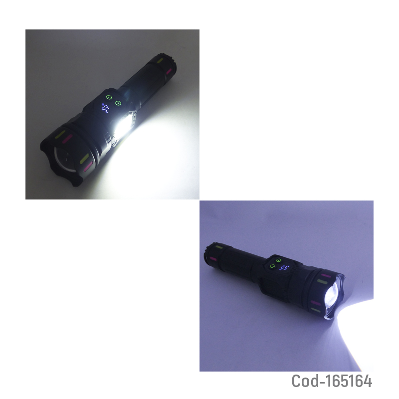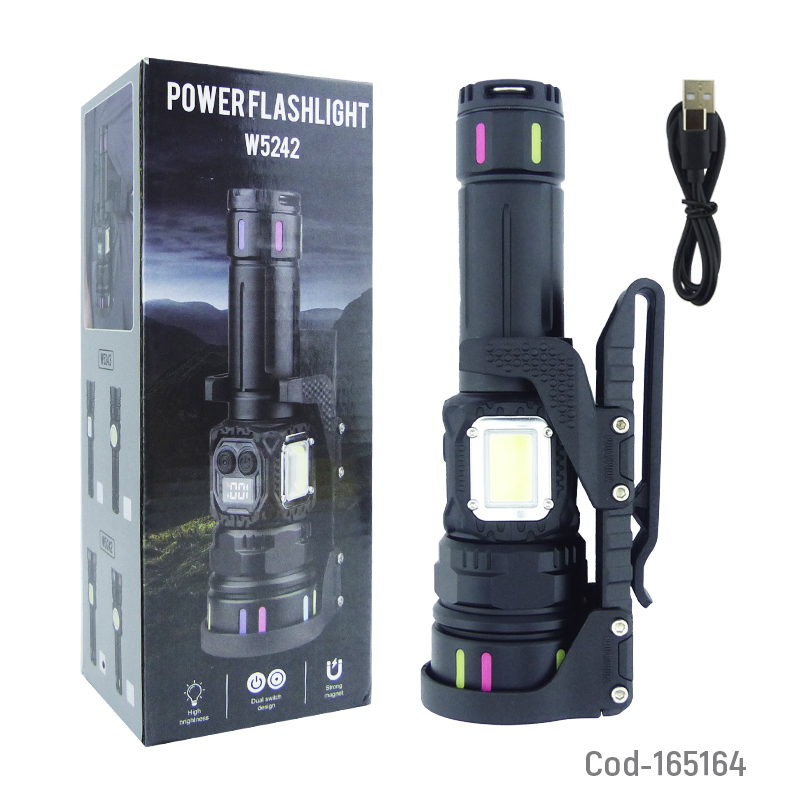Linterna táctica modelo W5242, con 1 LED principal y 1 LED COB lateral, Zoom ajustable y soporte para cinturón e imán. Recargable, potente y práctica para trabajo, camping o emergencias. Producto en caja.