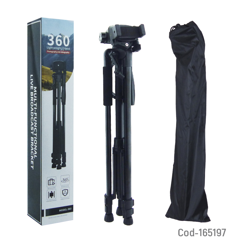 Trípode multifuncional de 1,6 metros en aluminio, con giro 360 grados, diseño estable y resistente, incluye funda de transporte, ideal para fotografía y video. Producto de alta calidad en caja.