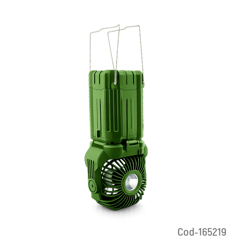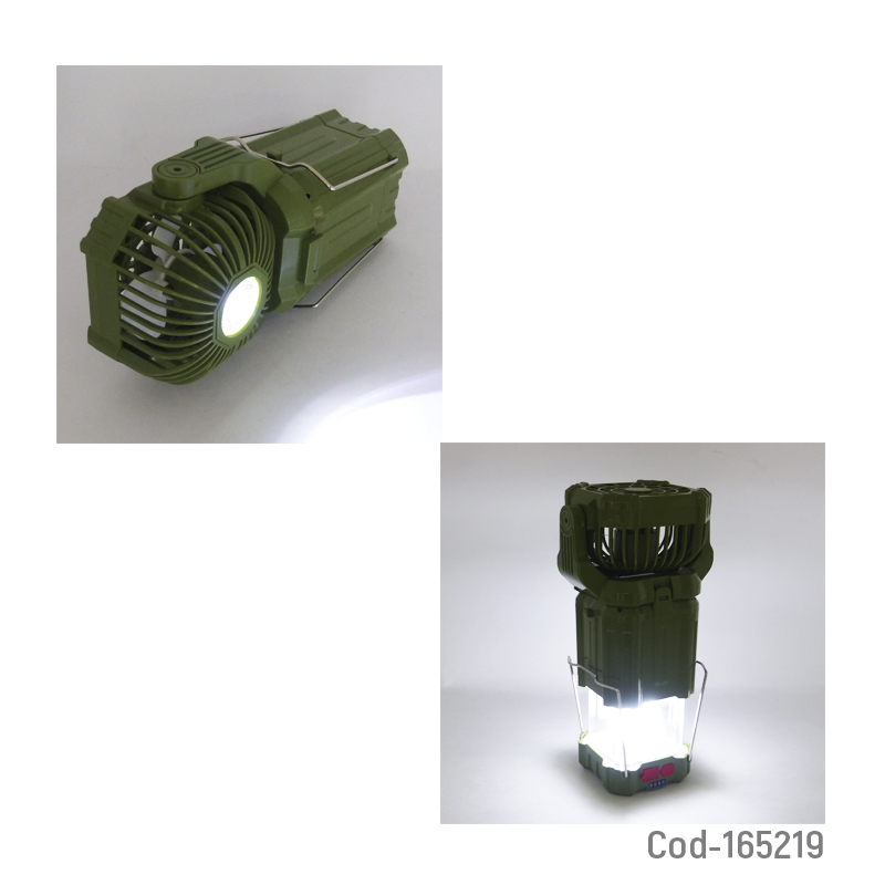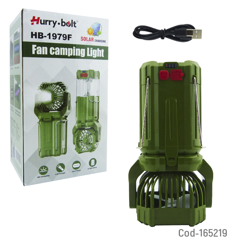 Farol plegable solar LED modelo HB1979 con ventilador integrado, recargable y portátil. Ideal para camping y emergencias. Producto en caja.