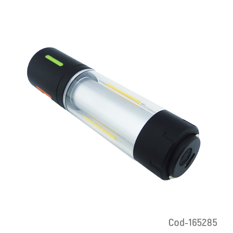Linterna modelo T-6 en aluminio, con 1 LED principal y 1 LED lateral. Recargable, con zoom ajustable, luz blanca cálida y estrobo rojo, ideal para trabajo y emergencias. Producto en caja.
