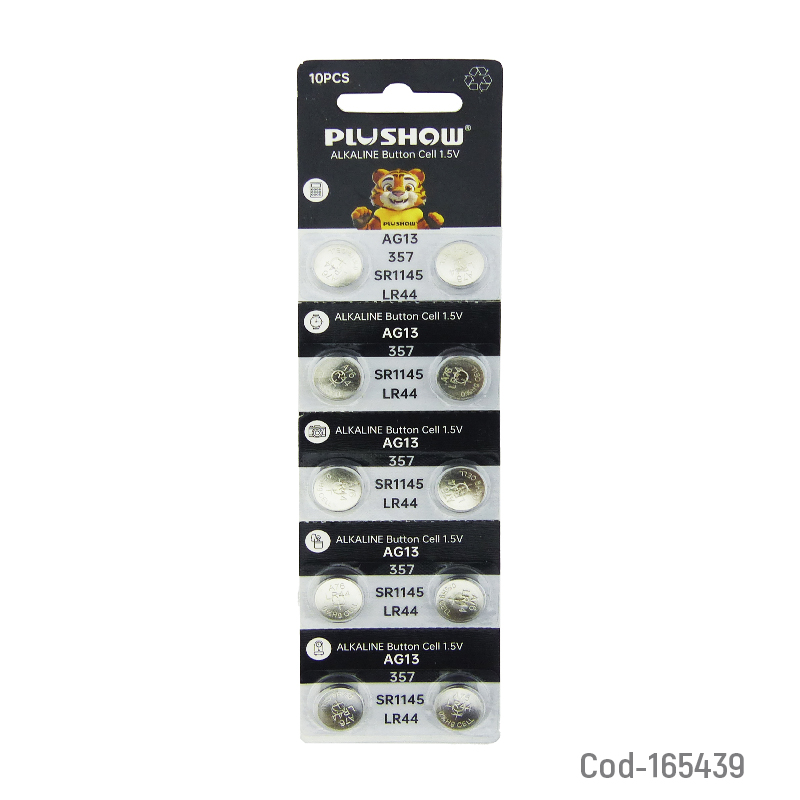 Pila PLUSHOW modelo AG-13 LR44, set por 10 piezas, 1,5 volt alcalina, ideal para relojes, calculadoras y pequeños dispositivos. Producto en blíster.