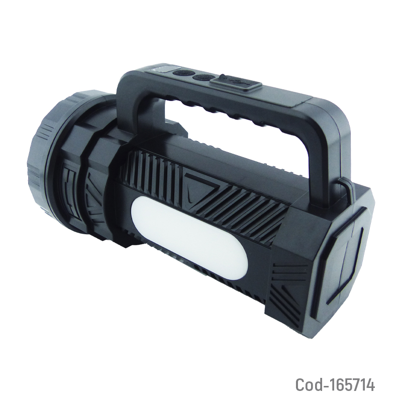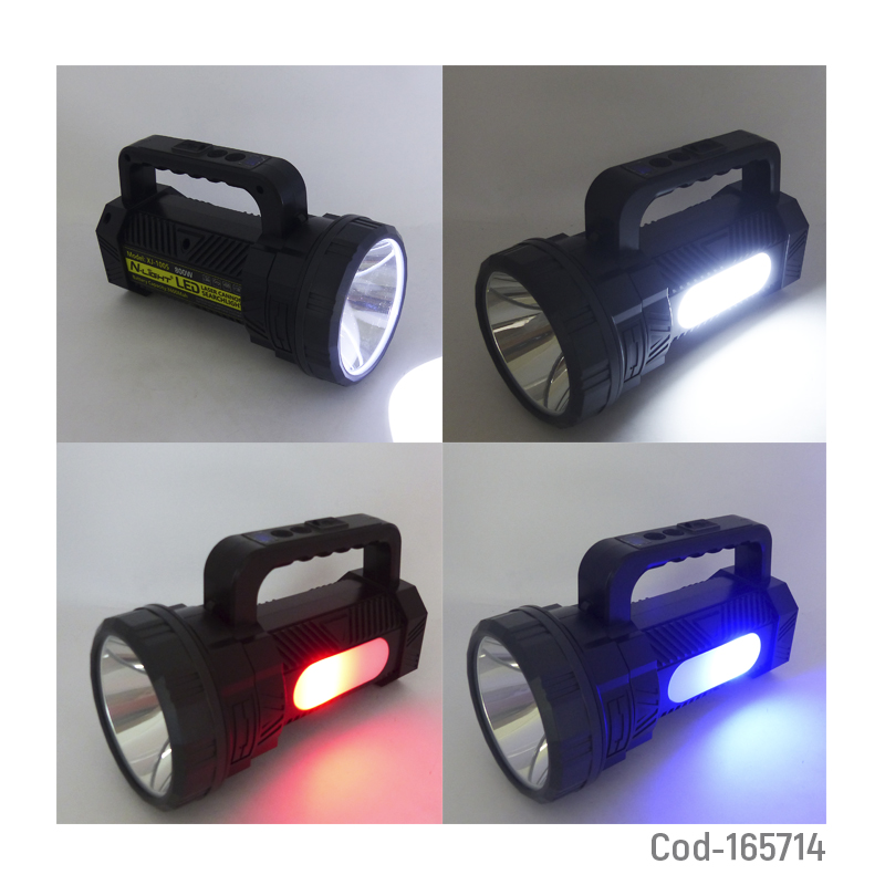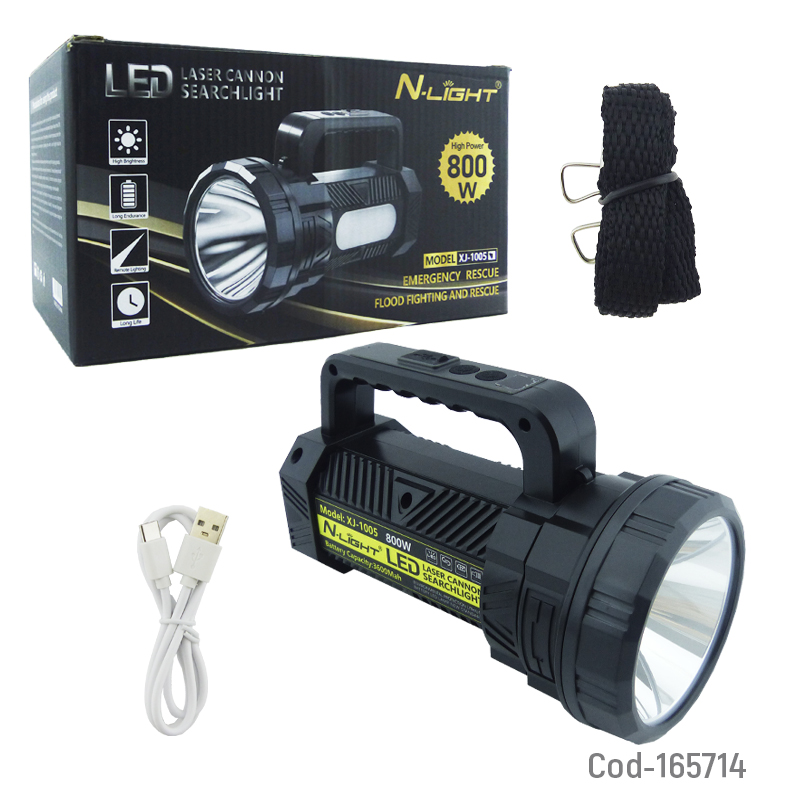 Foco Busca Camino LED de 800 W, modelo XJ-1005, recargable, con indicador de carga, alta potencia lumínica y diseño portátil, ideal para exteriores, emergencias y trabajos. Producto en caja.