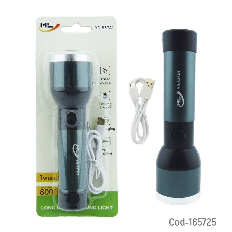 Linterna de 1 LED en aluminio, modelo YD-837A, recargable, compacta y resistente, ideal para uso diario, emergencias y exteriores. Producto en blíster.