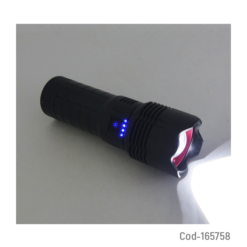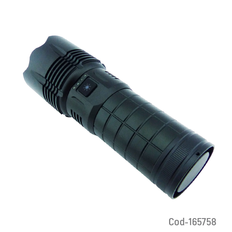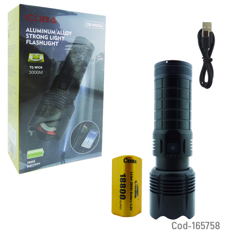 Linterna de 1 LED de aluminio con Zoom marca COBA, modelo CB-W522A, alcance de hasta 3000 m, luz láser integrada y función power bank. Recargable, resistente y de alto rendimiento. Producto en caja.