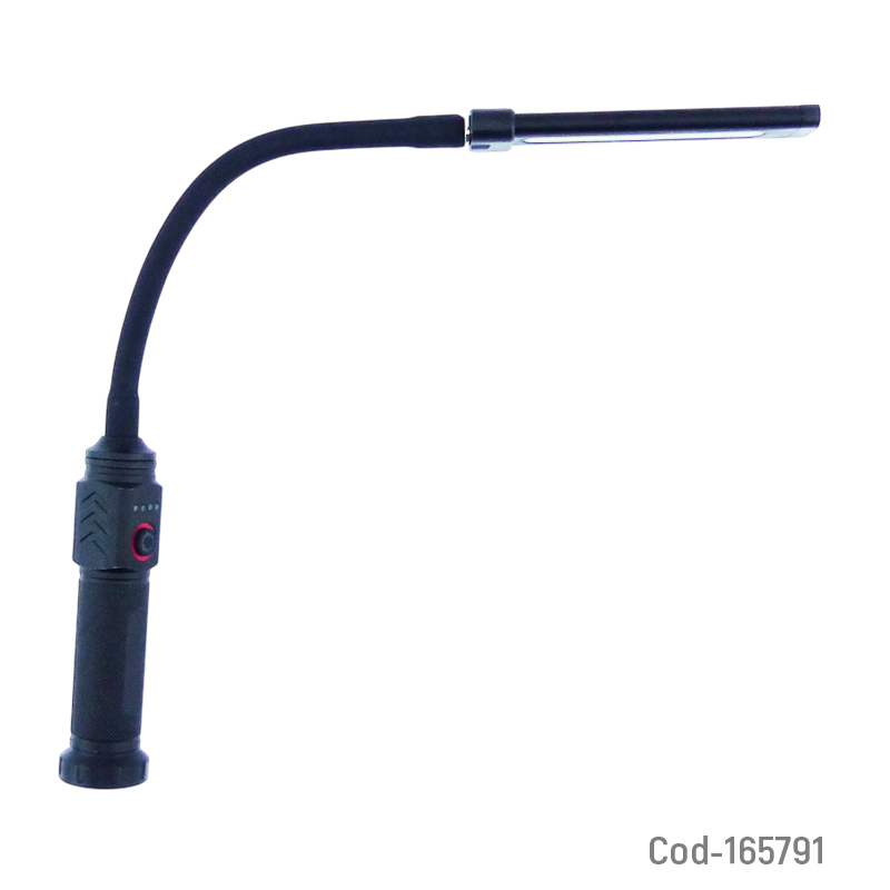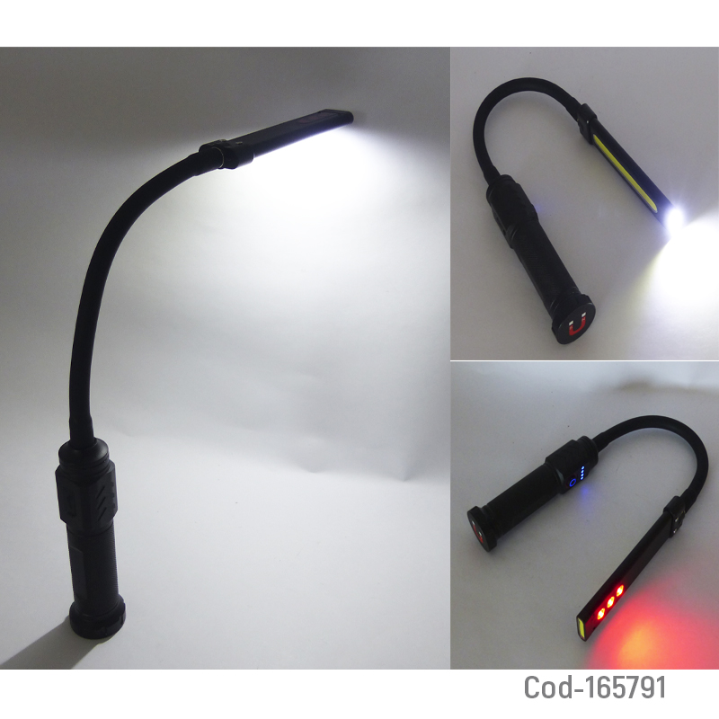 Linterna LED con 2 LED COB más 3 LED rojos, iluminación versátil para trabajo y emergencia, incluye imán y brazo flexible para uso manos libres, batería recargable, diseño práctico y resistente, producto presentado en caja.