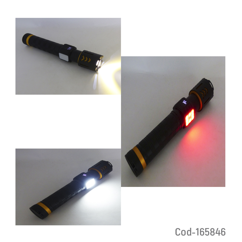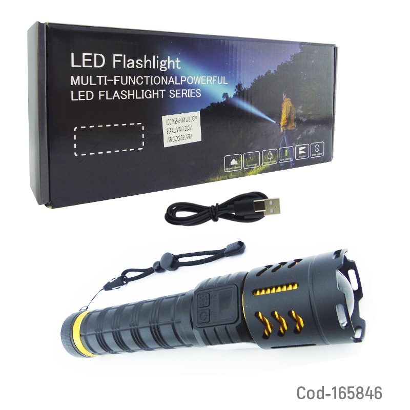 Linterna LED táctica de aluminio, recargable, con Zoom, luz láser blanca y función baliza, resistente y de alto rendimiento, ideal para seguridad, emergencias y uso exterior. Producto en caja.