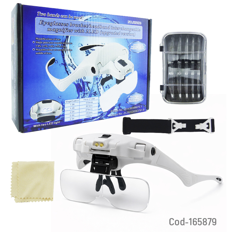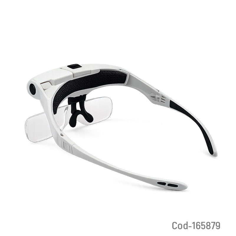 Lentes con lupas intercambiables de hasta 5 aumentos, tipo visera, ideales para trabajos de precisión. Funcionan a pilas y cuentan con 2 luces LED integradas. Pilas no incluidas. Producto presentado en caja.