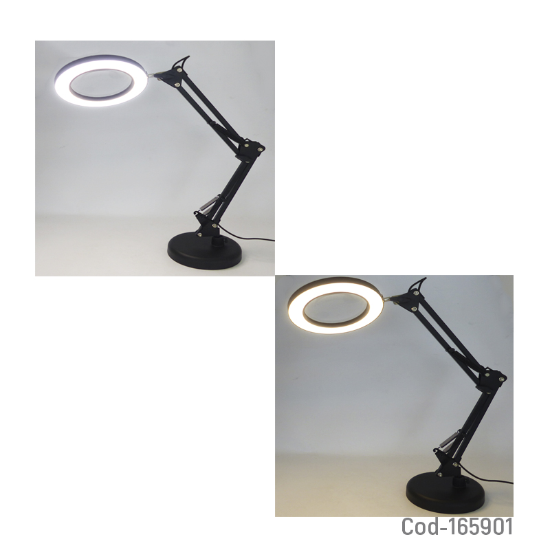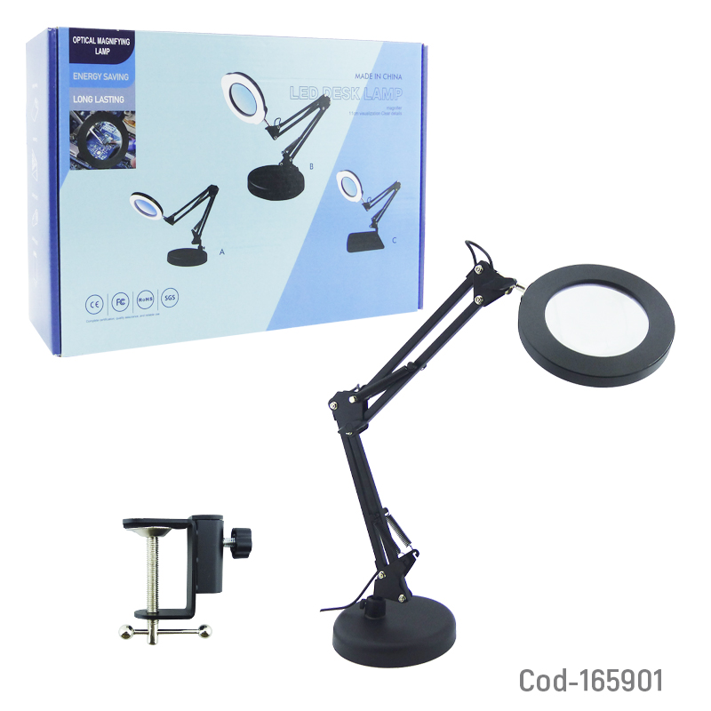 Lupa lámpara LED 2 en 1 con brazo articulado, incluye pinza para escritorio y base de sobremesa. Ofrece 3 tonos de luz para una iluminación precisa, ideal para manualidades, lectura y trabajos detallados. Producto en caja.