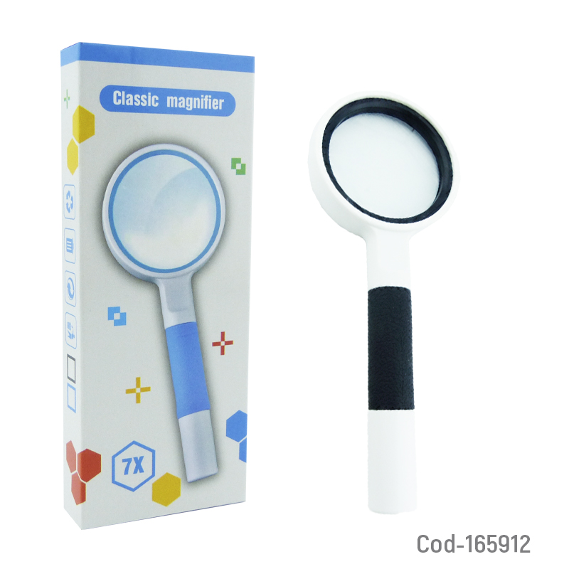 Lupa de 60 mm, modelo TH-8050, diseño clásico ideal para lectura y trabajos de detalle. Ofrece 7X de aumento para una visión clara y precisa. Producto presentado en caja.