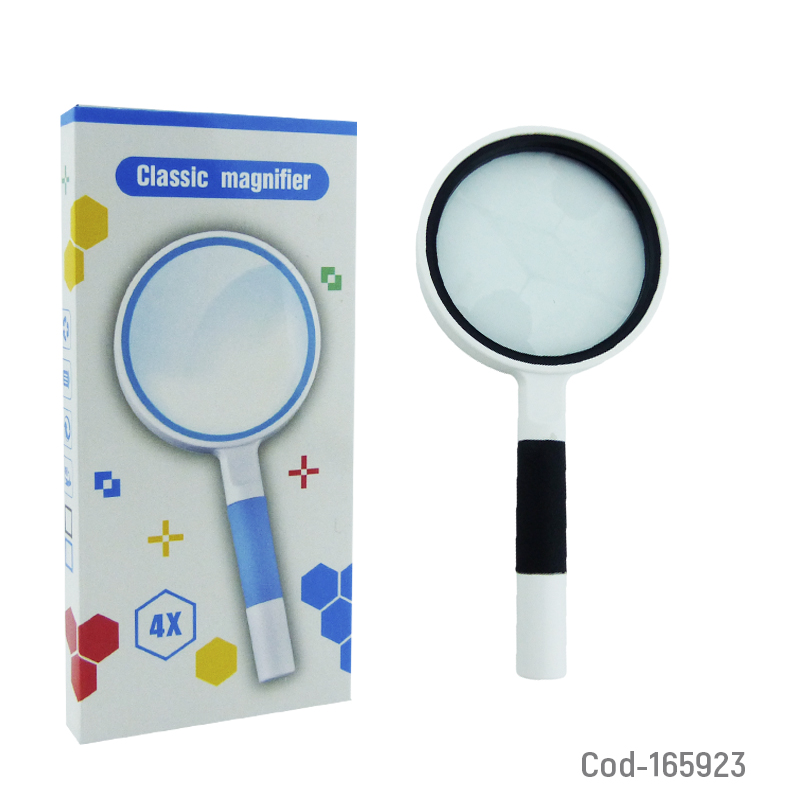 Lupa de 80 mm, modelo TH-8075, diseño clásico ideal para lectura y trabajos de detalle. Ofrece 4X de aumento para una visión clara y precisa. Producto presentado en caja.
