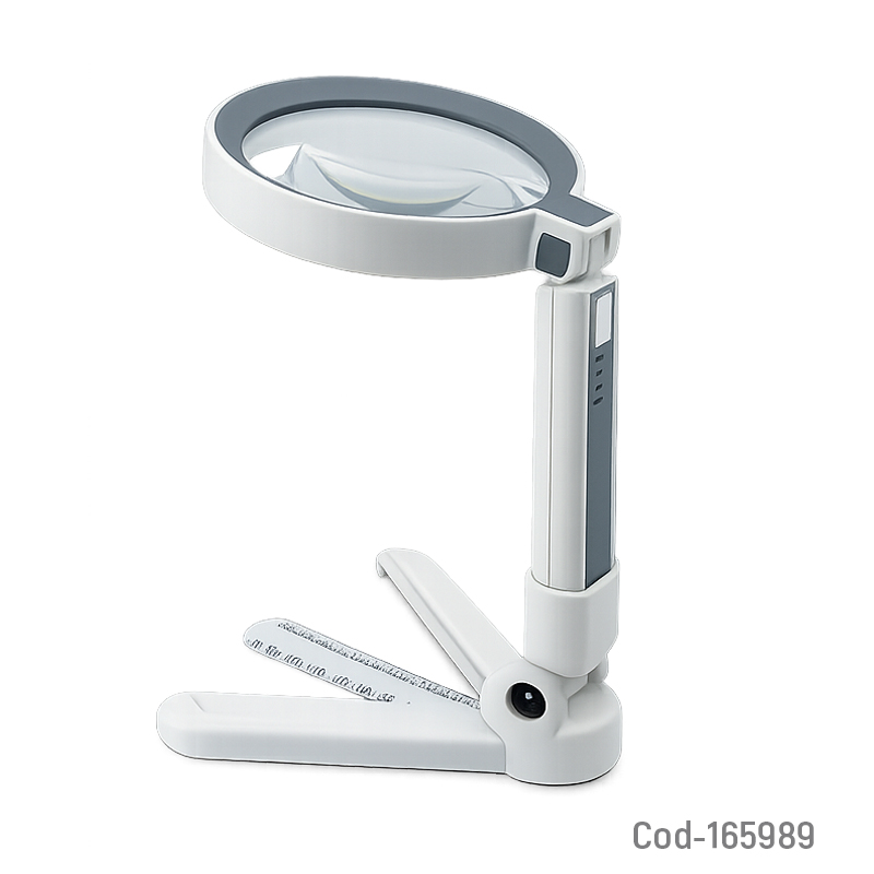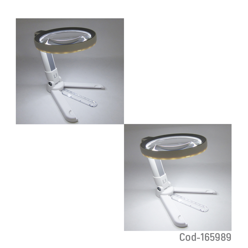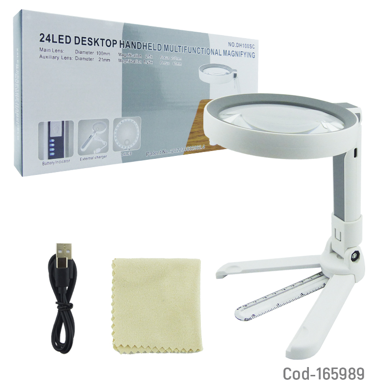 Lupa lámpara de 24 LED modelo DH100SC, diseñada para trabajos de precisión, lectura y manualidades. Ofrece iluminación clara y uniforme, soporte estable para mayor comodidad e indicador de carga. Batería recargable y presentación en caja.