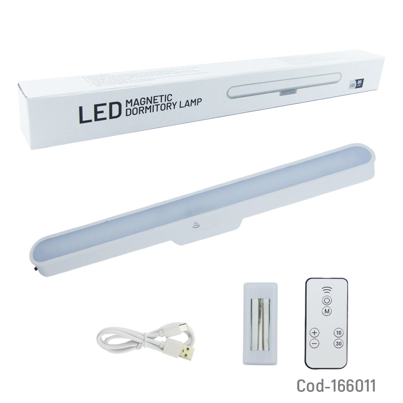 Lámpara para dormitorio magnética recargable con control remoto. Diseño práctico y moderno, fácil de instalar, ideal para iluminación ambiental y uso nocturno. Producto en caja.