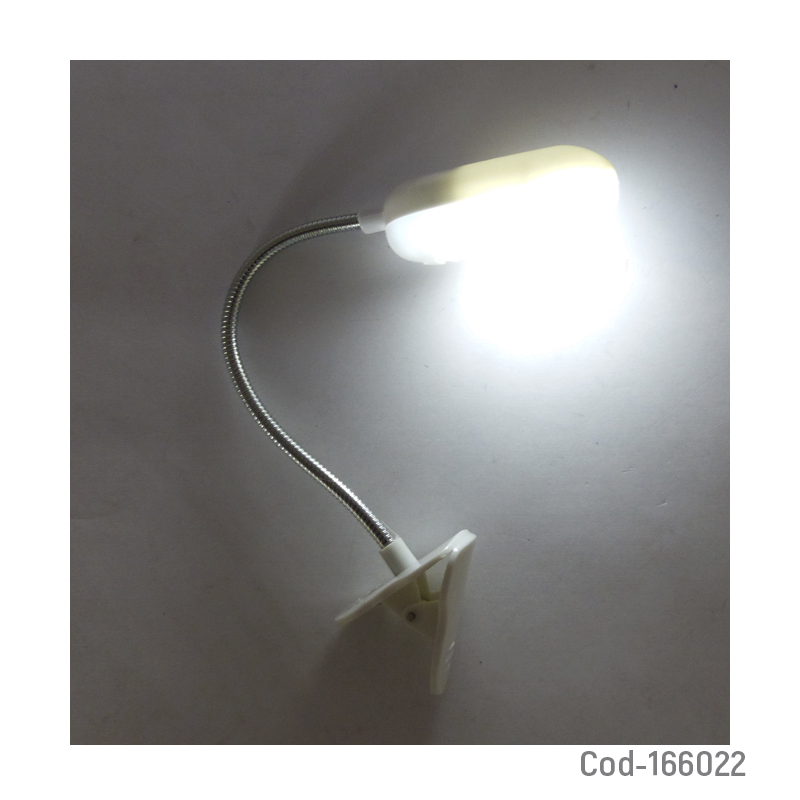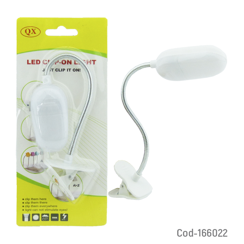 Lámpara LED mini modelo QX con luz blanca ajustable, incluye gancho para sujetarse. Compacta y práctica. Ideal para lectura. Producto en blíster.