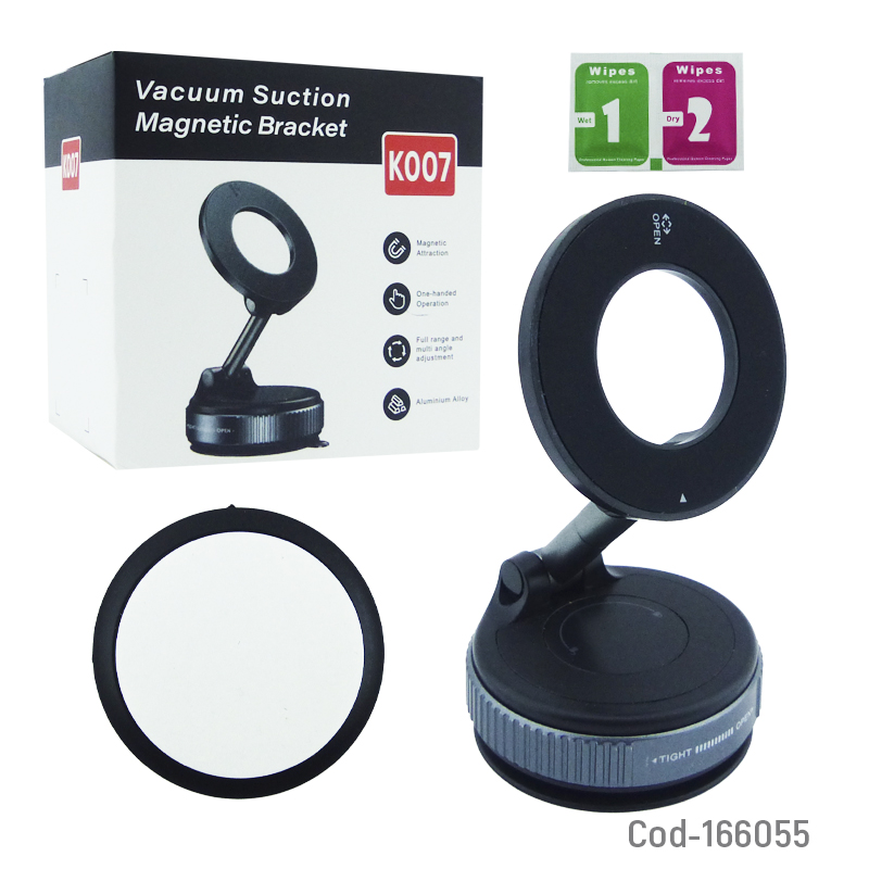 Porta smartphone con sistema magnético, brazo ajustable y giro de 360 grados para una visualización cómoda y segura. Diseño práctico y versátil. Producto en caja.