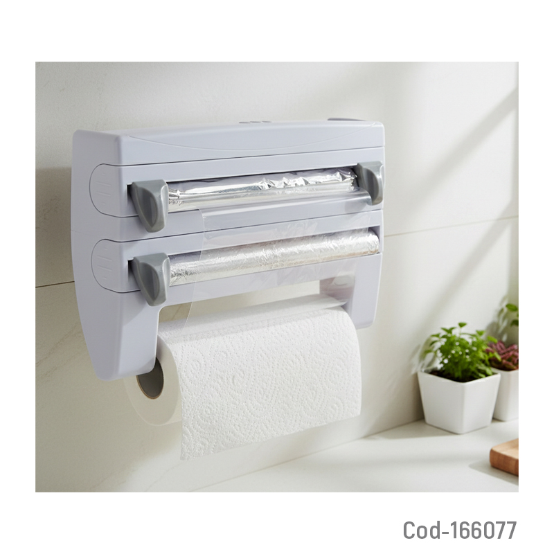 Dispensador triple para cocina, práctico y funcional, ideal para papel absorbente, film y papel aluminio. Diseño compacto y fácil de instalar, optimiza el espacio y facilita el uso diario. Papel no incluido. Producto en caja.