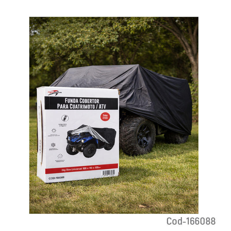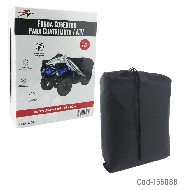 Funda cobertor para cuatrimoto o ATV marca PROBIKER, fabricada en material impermeable de alta calidad. Brinda protección efectiva contra lluvia, polvo, sol y suciedad, ayudando a prolongar la vida útil del vehículo. Ideal para uso interior y exterior. Producto en caja.