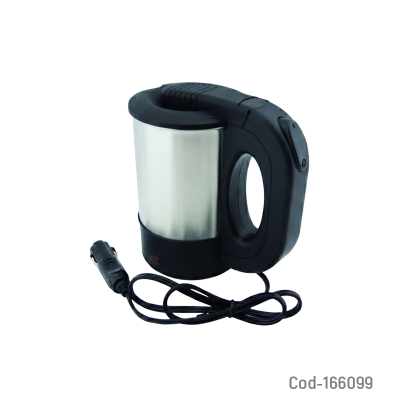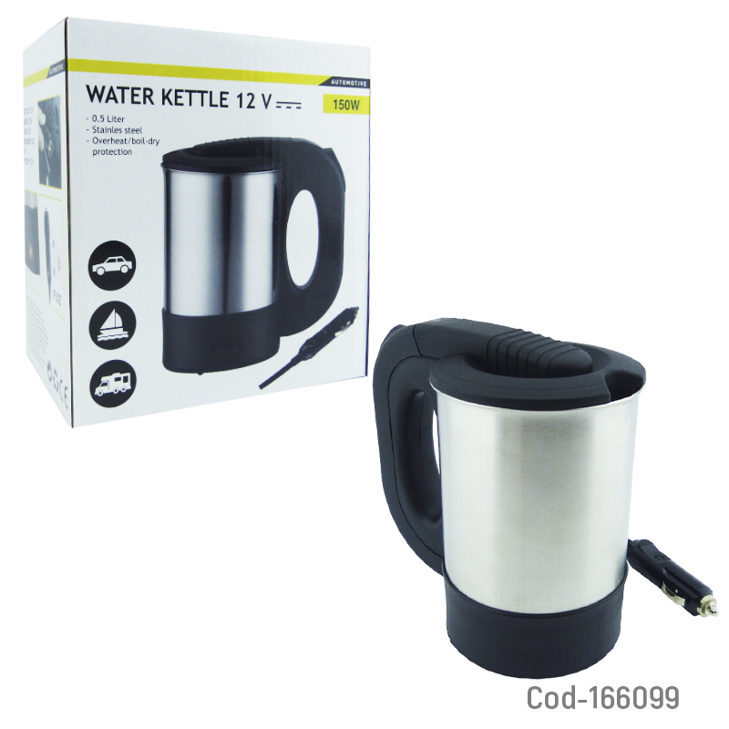 Calentador de agua para auto 12 volt en acero inoxidable. Capacidad de 500 CC. y potencia de 150 watt. Ideal para viajes, camping y uso en carretera. Producto en caja.