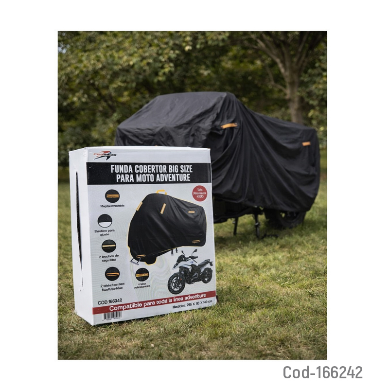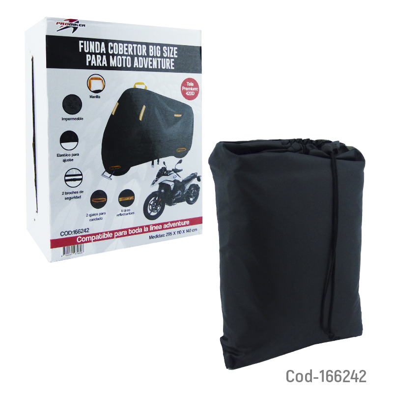 Funda para moto marca PROBIKER para modelo ADVENTURE, fabricada en tela 420D de alta calidad. Incorpora ojales para mayor seguridad y ajuste firme. Protege eficazmente contra lluvia, polvo y sol. Producto en caja.