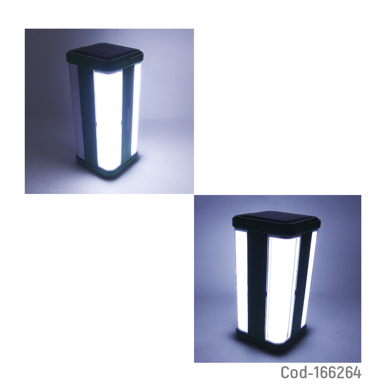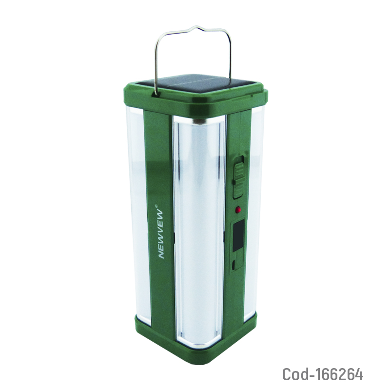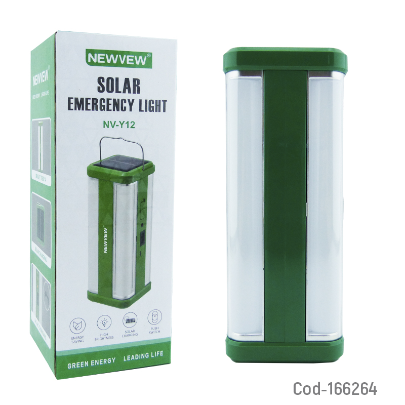 Lámpara solar LED de 4 tubos, modelo NV-Y12, marca NEWVEW. Recargable, con iluminación potente y uniforme de amplio alcance. Ideal para uso en interiores, camping o situaciones de emergencia. Producto en caja.