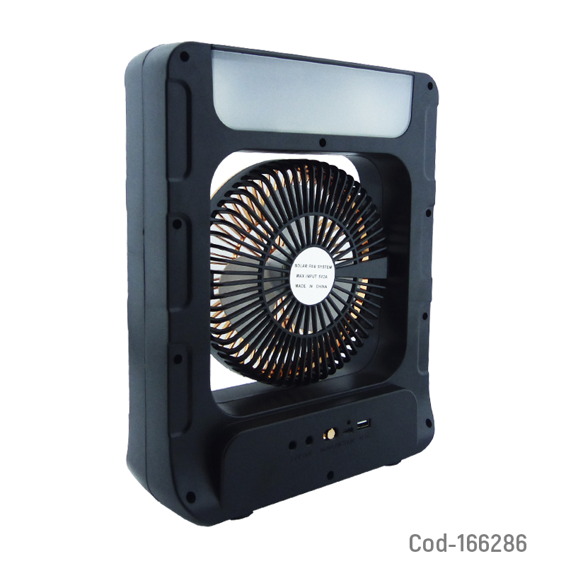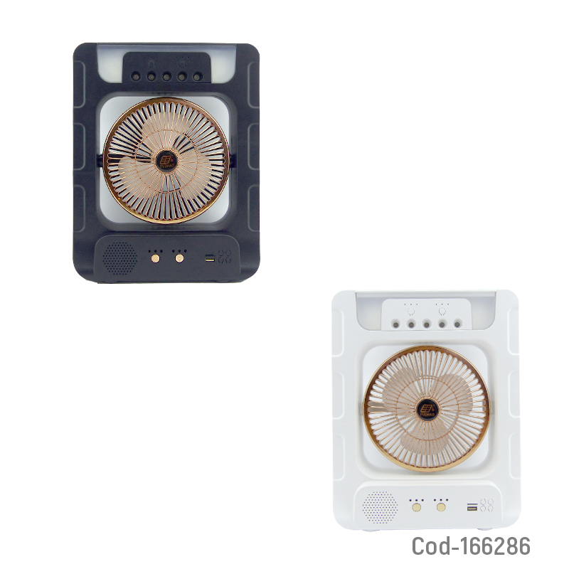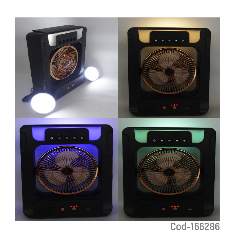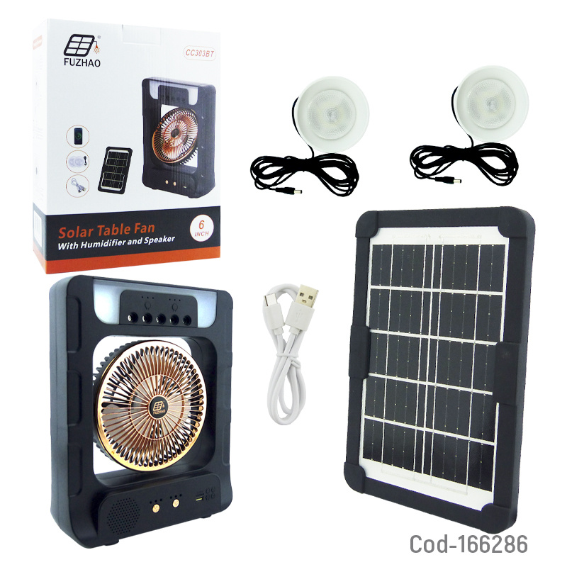 Ventilador solar modelo CC303 multifunción, ideal para camping, hogar o emergencias. Incorpora sistema de vapor para mayor frescura, parlante Bluetooth, entrada USB y ranura TF. Incluye luz LED RGB, 2 ampolletas externas y panel solar para funcionamiento sin electricidad. Producto en caja.