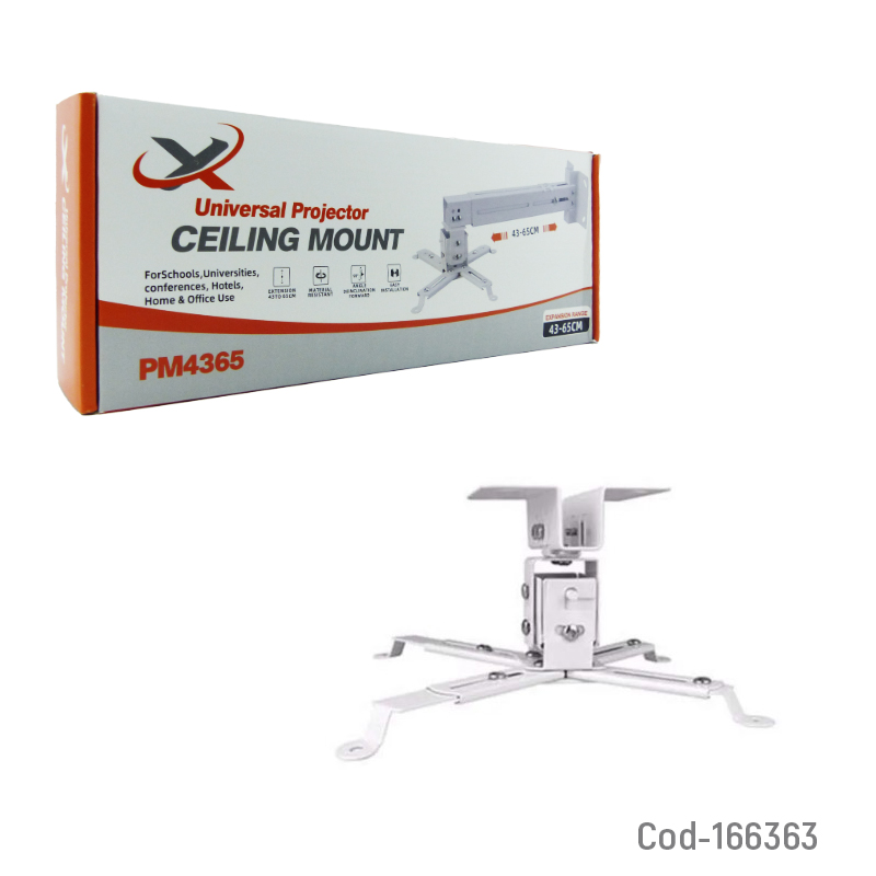 Soporte para proyector universal modelo MP4365, brazo extensible ajustable de 43 a 65 cm, compatible con distintos modelos de proyector. Resistente y fácil de instalar. Producto en caja.