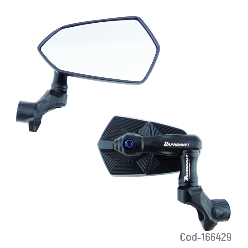 Espejos para moto modelo 262 CNC articulado marca BAPHONNET, diseño panorámico que amplía el campo de visión para mayor seguridad al conducir. Fabricados en material resistente con acabado de precisión y sistema articulado que permite ajustar el ángulo según necesidad. Ideales para distintos tipos de moto. Producto de alta calidad en caja.