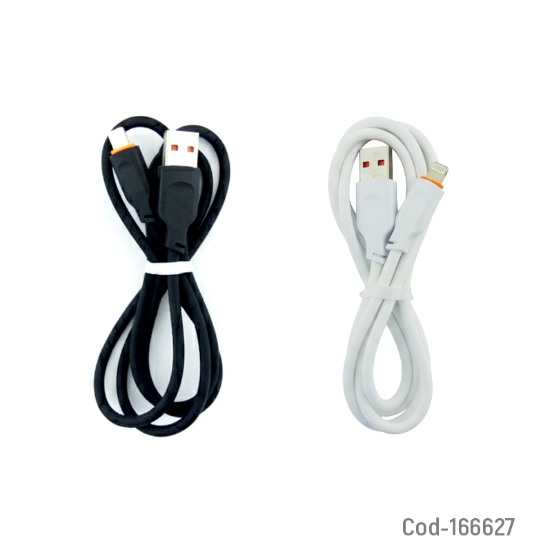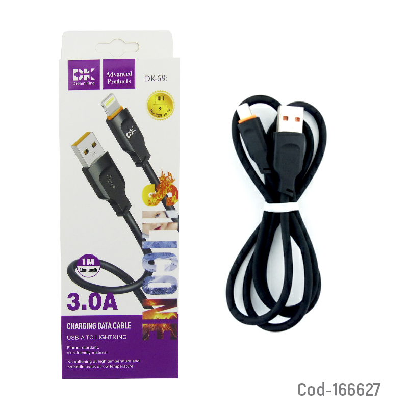 Cable para IPhone a USB modelo DK-69I de 3 Amp en silicona, apto para carga y transferencia de datos. Flexible y resistente, disponible en 2 colores. Producto en caja.
