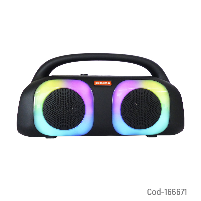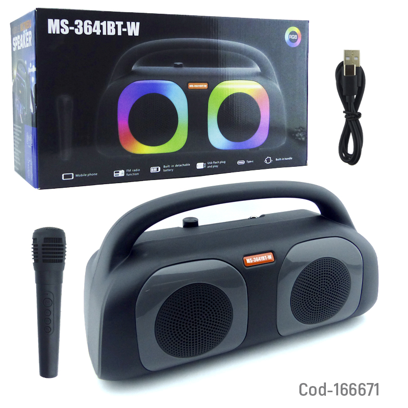 Parlante karaoke portátil recargable modelo MS-3641BT con micrófono recargable incluido y luz RGB integrada. Conexión Bluetooth, sonido potente y diseño práctico para fiestas y reuniones. Producto en caja.