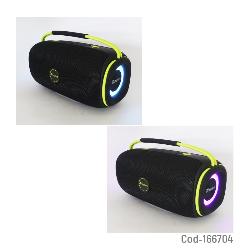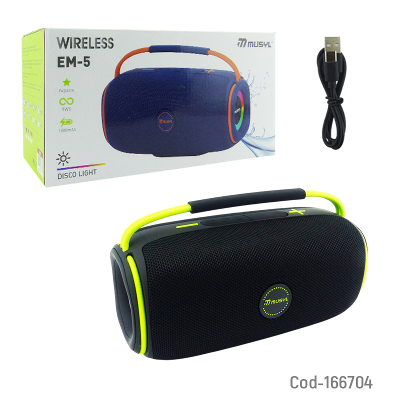 Parlante recargable Bluetooth modelo EM-5 marca MUSYL portable, sonido potente y claro, iluminación RGB integrada, conexiones USB, AUX, TF y DC, diseño compacto y fácil de transportar, producto presentado en caja.