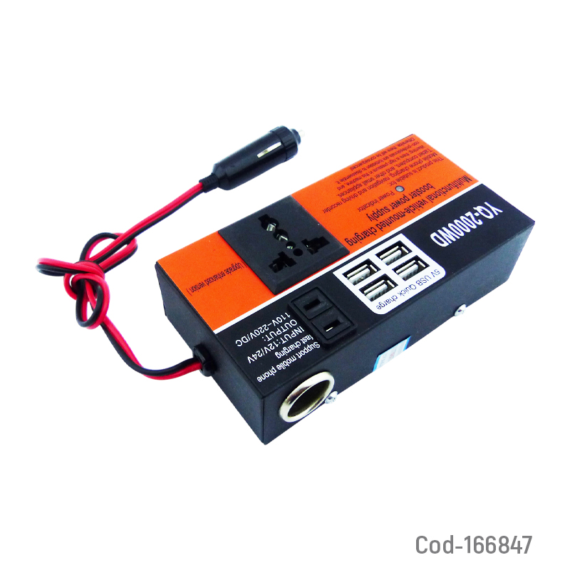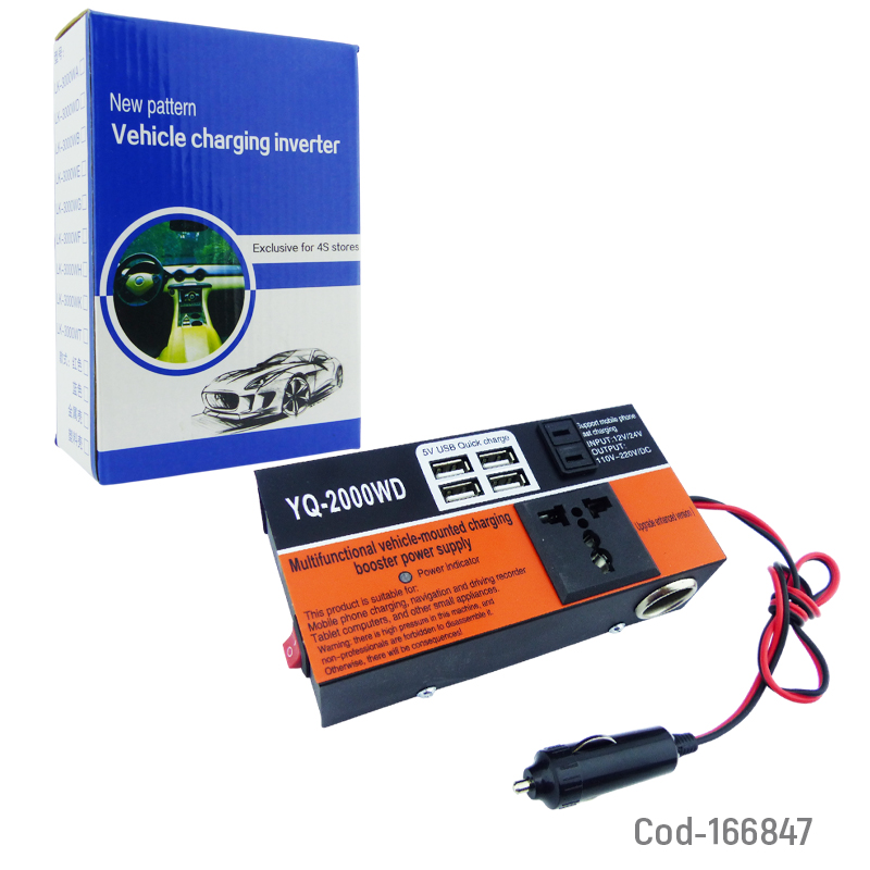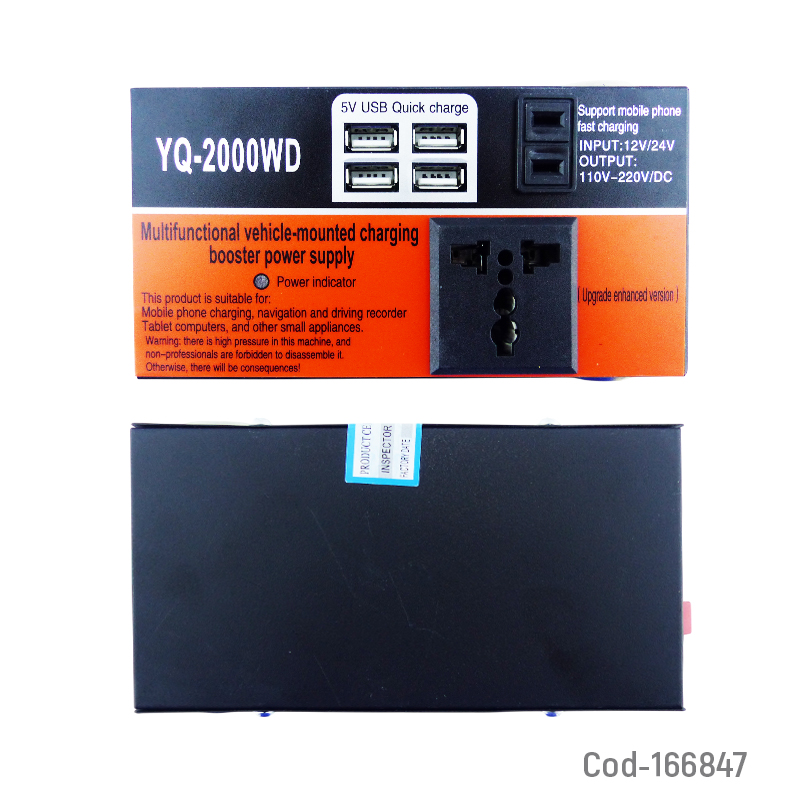 Inversor de voltaje modelo YQ-2000 compatible con sistemas de 12 o 24 voltios, salida a 220 voltios. Ideal para convertir energía de vehículos o baterías y alimentar equipos eléctricos. Producto presentado en caja.
