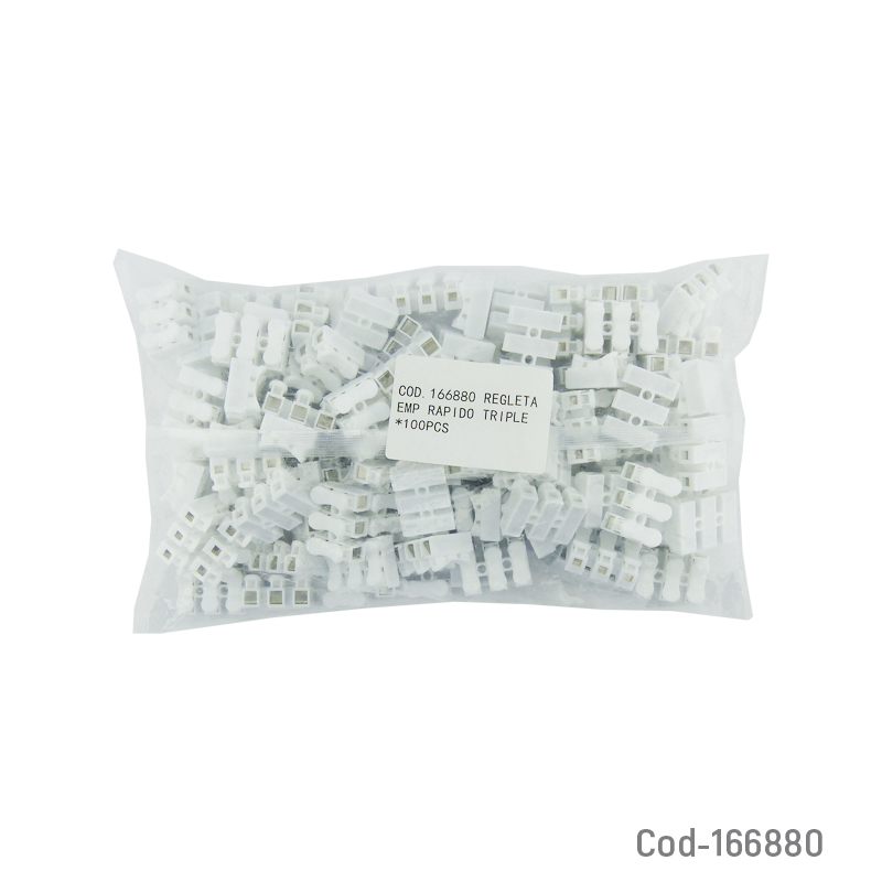 Regleta de empalme rápido LED triple, permite unir cables o tiras LED de forma sencilla y segura sin soldar. Ideal para instalaciones rápidas y ordenadas. Producto en bolsa.