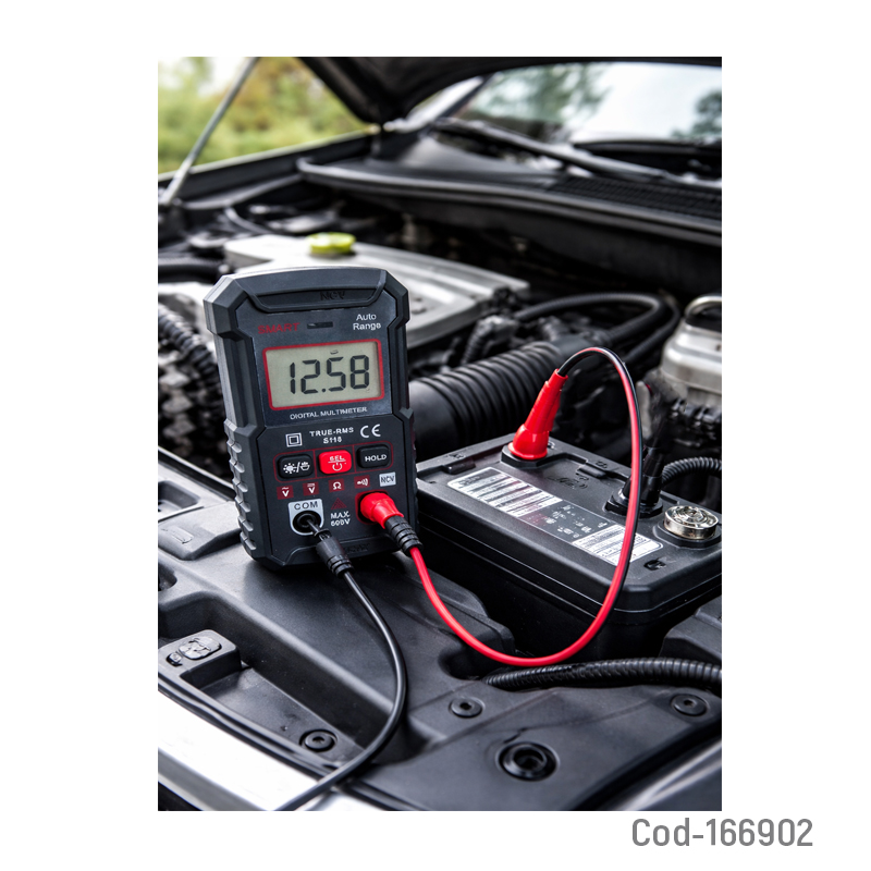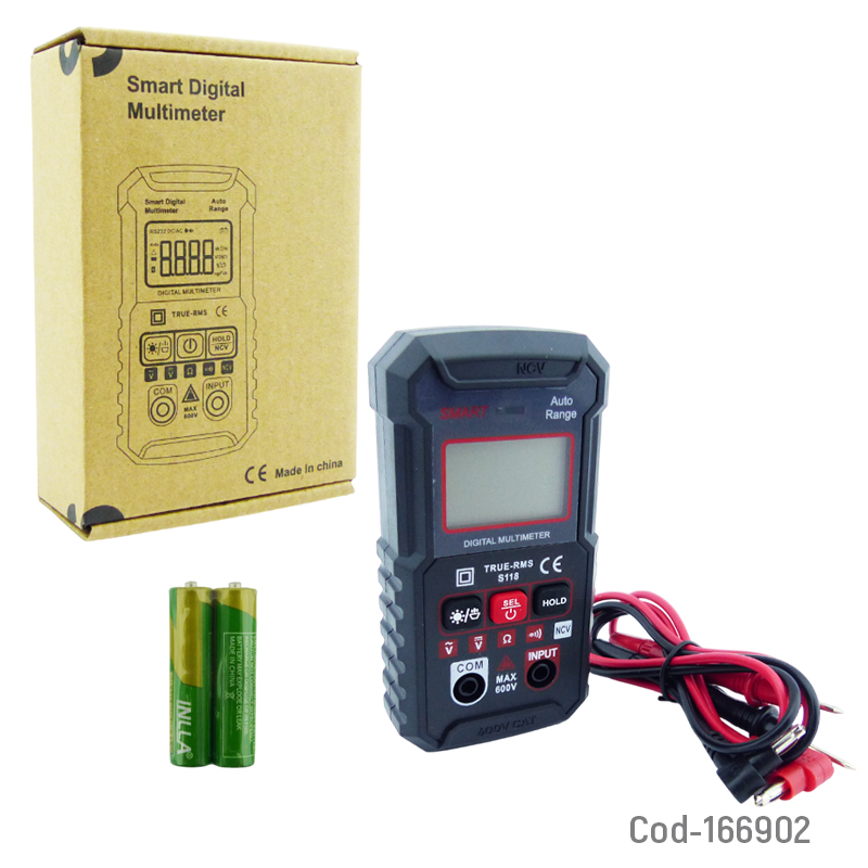 Tester digital automático modelo S118, ideal para medir voltaje, corriente, resistencia y continuidad con alta precisión. Incluye pantalla digital de fácil lectura, selección automática de funciones y diseño compacto. Viene con cables de medición y pilas incluidas, listo para usar. Producto en caja.