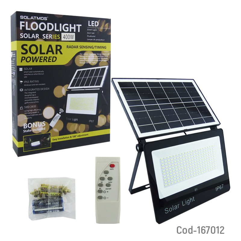 Proyector solar LED de 400 watt plegable con 200 LED, incorpora sensor Y Control Remoto. Ideal para iluminación exterior eficiente y sin consumo eléctrico. Producto en caja.