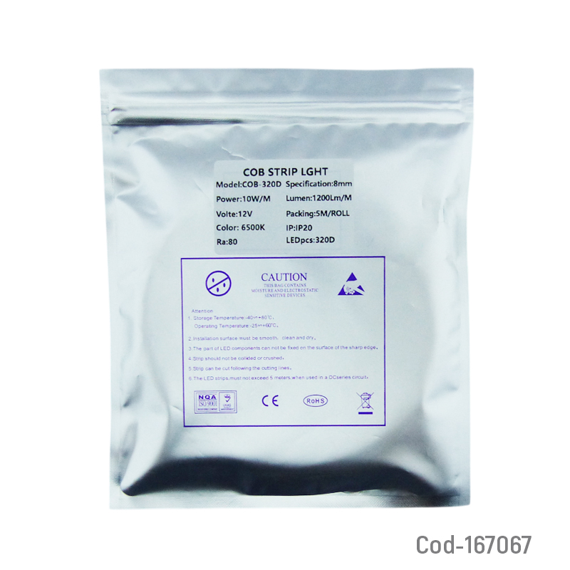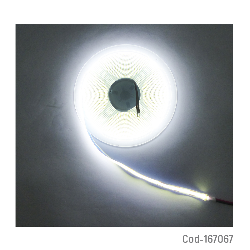 Rollo LED COB blanco de 12 volt sin funda, 5 mts de largo, iluminación continua y uniforme, alta eficiencia lumínica, ideal para proyectos decorativos y de iluminación interior, producto presentado en bolsa.