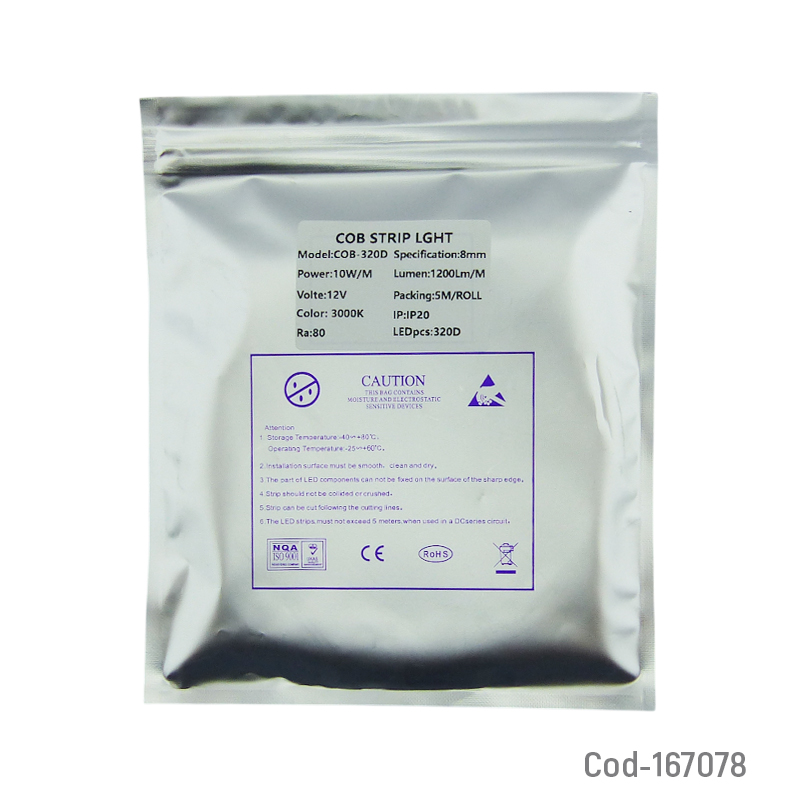 Rollo LED COB Luz Calida de 12 volt sin funda, 5 mts de largo, iluminación continua y uniforme, alta eficiencia lumínica, ideal para proyectos decorativos y de iluminación interior, producto presentado en bolsa.