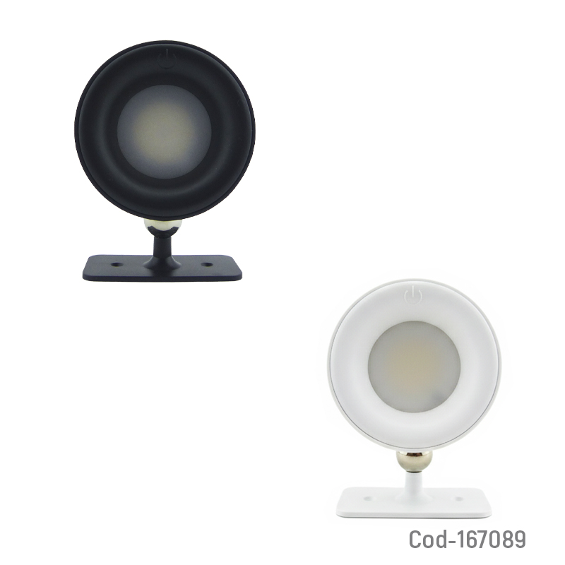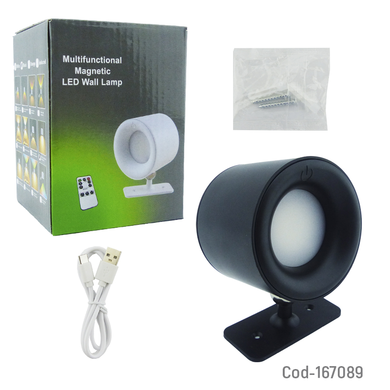 Lámpara LED recargable con imán, diseño dirigible y control touch, ofrece 3 tonos de luz. Disponible en dos colores, ideal para uso práctico en distintos espacios. Producto en caja.