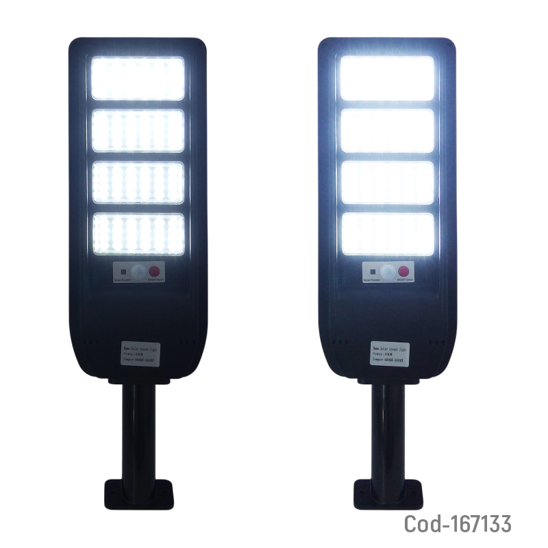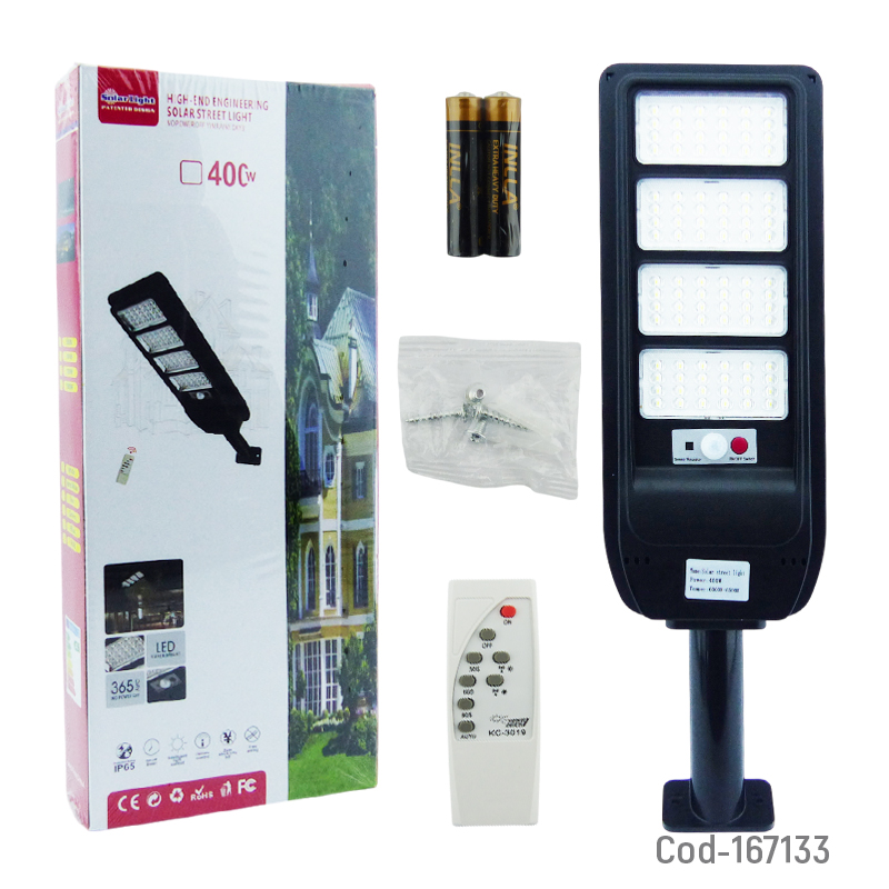 Foco con brazo solar de 400 watt modelo LH-99, equipado con 96 LED distribuidos en 4 placas, alta potencia de iluminación, incluye control remoto y sensor de movimiento, funcionamiento automático y eficiente, ideal para exteriores, producto presentado en caja.