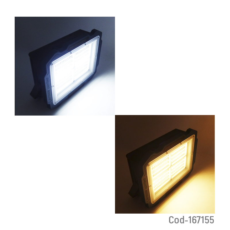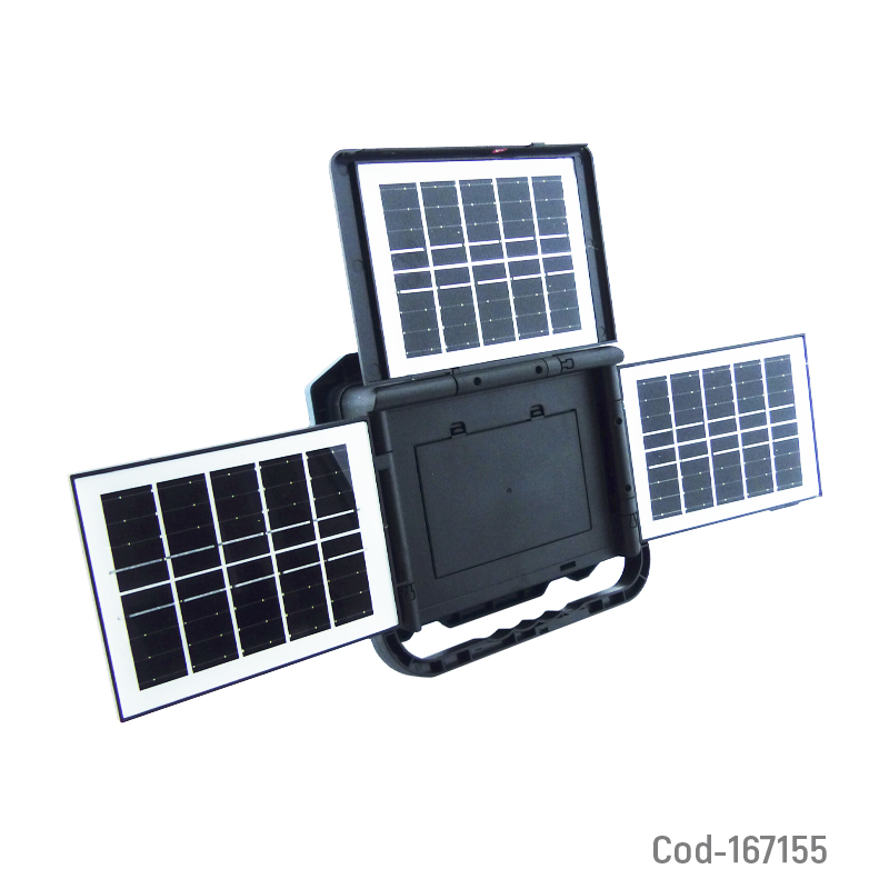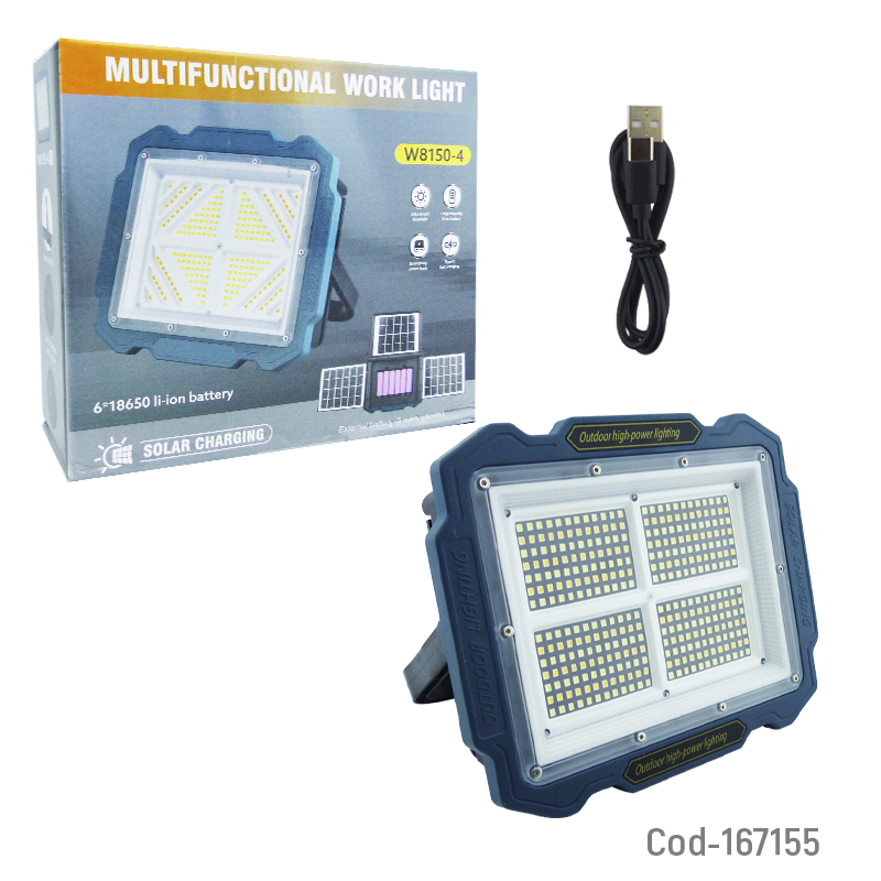 Proyector solar LED modelo W8150-3 con 3 paneles solares y 336 LED de alta luminosidad. Ofrece 3 tonos de luz, incluye gancho para colgar y permite una iluminación amplia y eficiente en exteriores. Producto en caja.