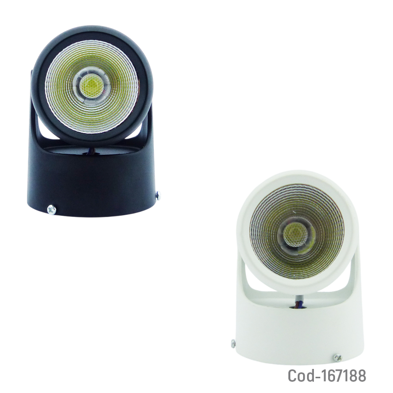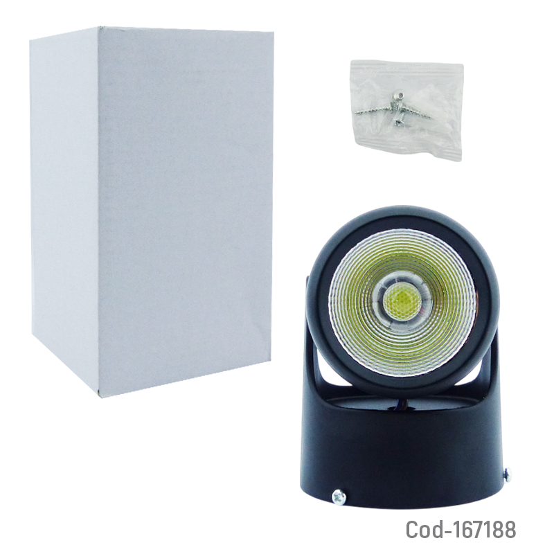 Foco LED de 12 watt tipo spot, luz blanca 6500 K, diseño dirigible para orientar la iluminación, apto para instalación en cielo o muro, bajo consumo y buena luminosidad, disponible en dos colores, producto presentado en caja.