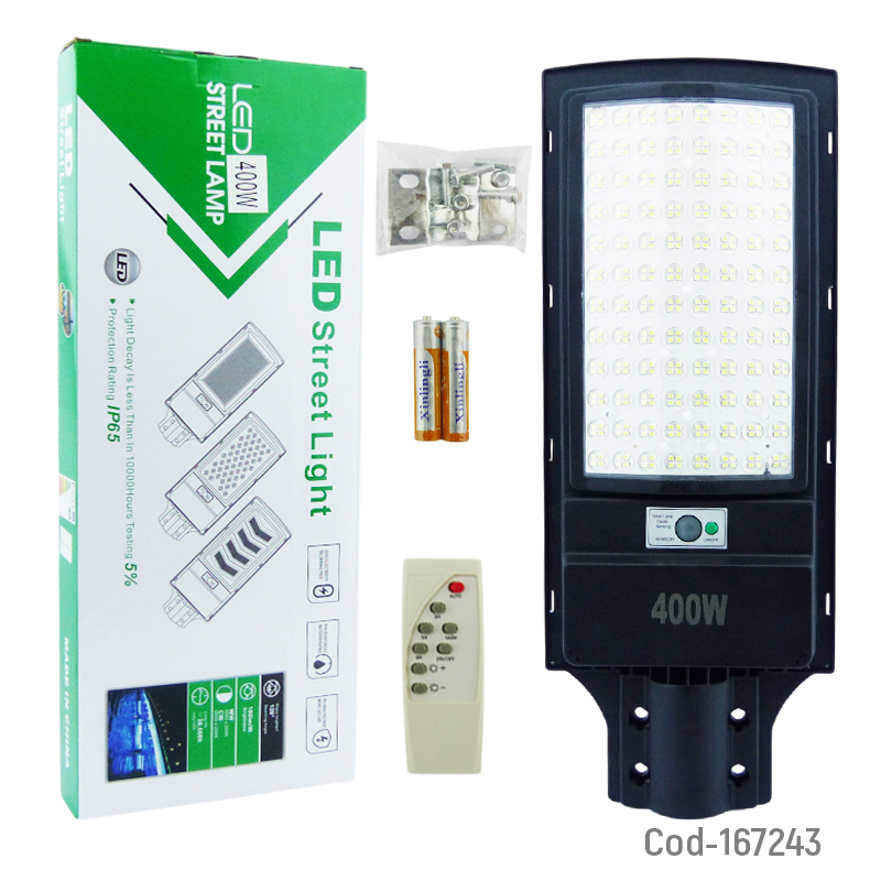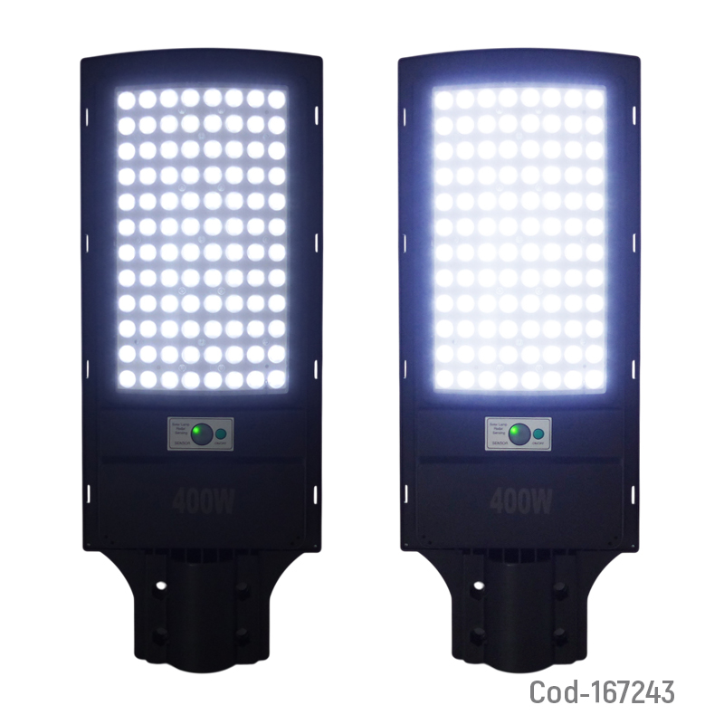Foco para poste solar de 400 watt con 384 LED en una sola placa, diseñado para brindar iluminación potente y de amplio alcance. Incorpora sensor de movimiento y control remoto para un uso cómodo y eficiente. Ideal para calles, patios y áreas exteriores. Producto presentado en caja.