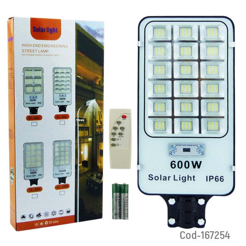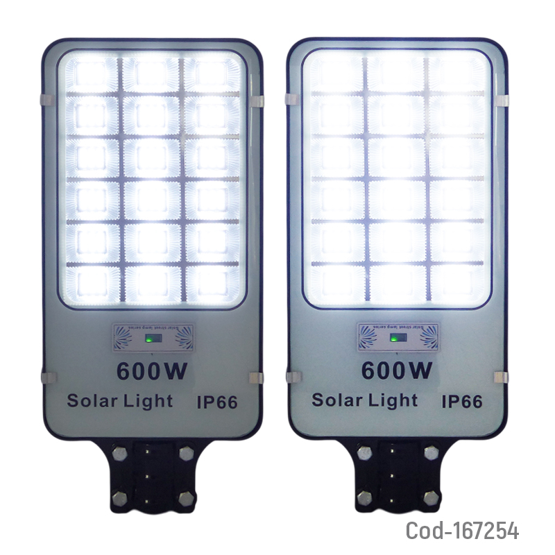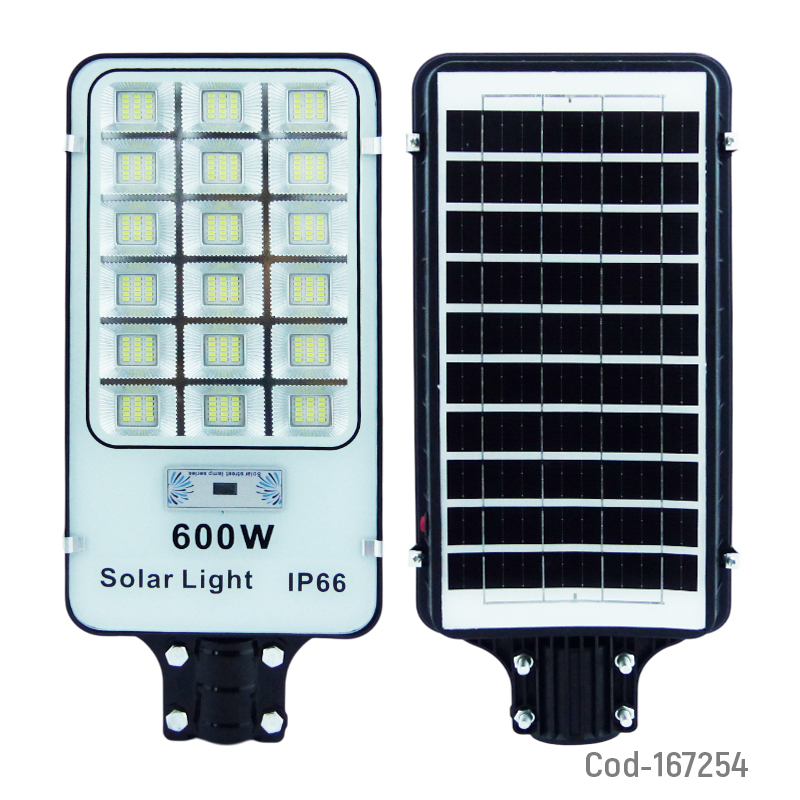 Foco para poste solar de 600 watt con 270 LED en 18 placas, diseñado para brindar iluminación potente y de amplio alcance. Incorpora sensor de movimiento y control remoto para un uso cómodo y eficiente. Ideal para calles, patios y áreas exteriores. Producto presentado en caja.