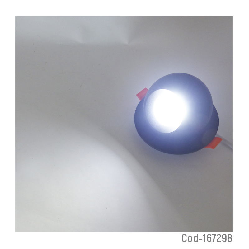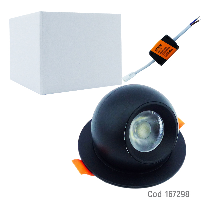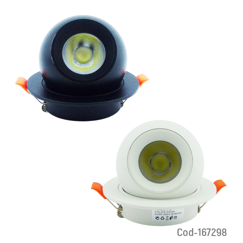 Foco LED de 7 watt tipo embutido, luz blanca 6500 K, diseño dirigible para orientar la iluminación, apto para instalación en cielo, bajo consumo y buena luminosidad, disponible en dos colores, producto presentado en caja.