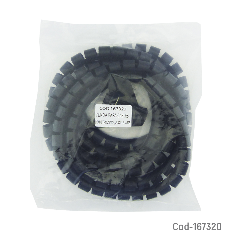 Organizador de cable en espiral en PVC, ideal para proteger y ordenar cables eléctricos o de datos. Flexible y fácil de instalar. Producto en bolsa.