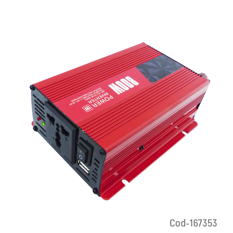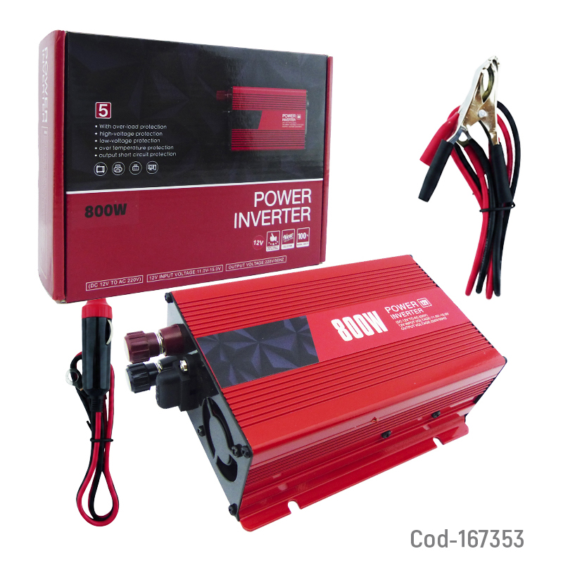 Inversor de voltaje para auto de 12 volt con USB de 800 watt, ideal para convertir energía del vehículo y alimentar equipos electrónicos. Incluye cable tipo pinza, diseño resistente y confiable. Producto de alta calidad en caja.