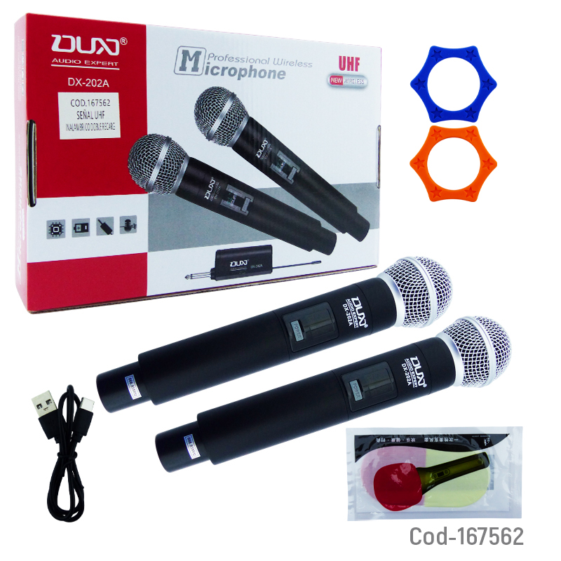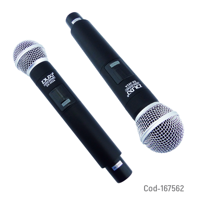 Micrófono inalámbrico profesional set x2 modelo DX-202A con señal UHF y pantalla integrada. Producto recargable, ideal para presentaciones, eventos y amplificación de voz. Presentado en caja.