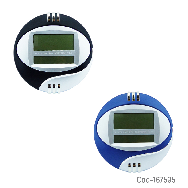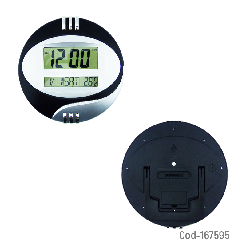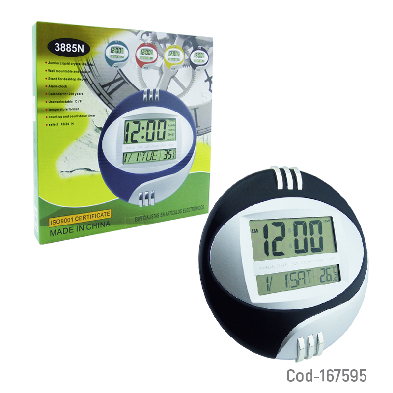 Reloj digital 2 en 1 para muro o escritorio, modelo B-79 redondo, con alarma, fecha y temperatura, pantalla clara y fácil de leer, diseño práctico y decorativo, disponible en dos colores, producto presentado en caja.