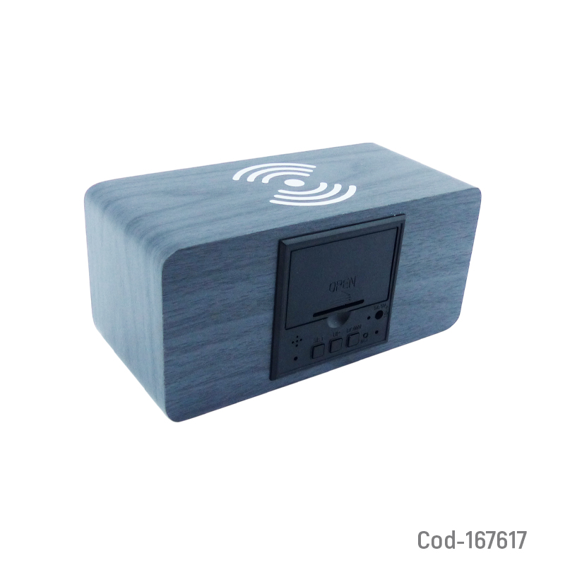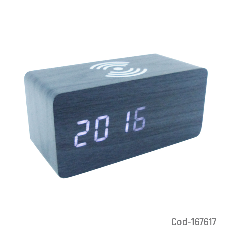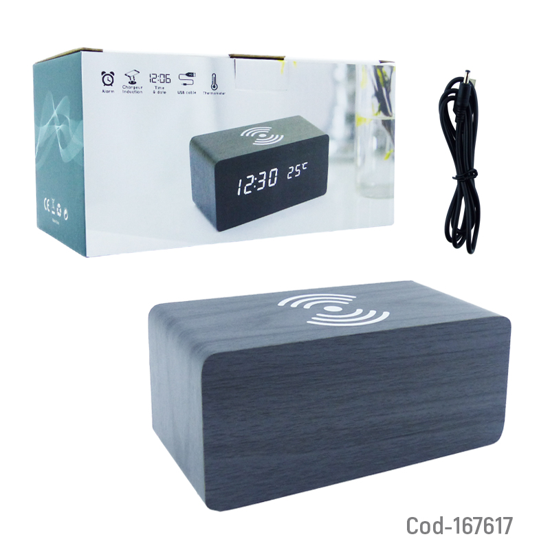 Reloj despertador digital con alarma, función de carga inalámbrica para smartphones compatibles, indicador de temperatura, diseño moderno y práctico, disponible en dos colores, producto presentado en caja.