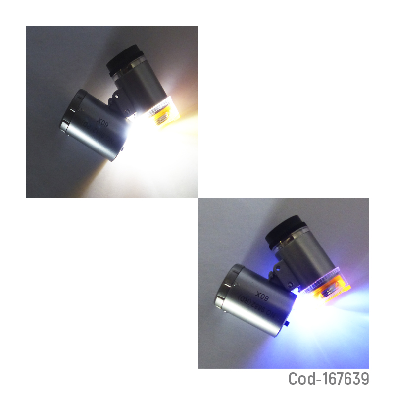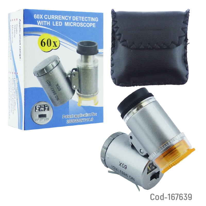 Microscopio lupa de bolsillo modelo 9882 de 60x, aumento preciso para detalles pequeños, luz LED integrada, diseño compacto y portátil, incluye estuche de protección, producto presentado en caja.