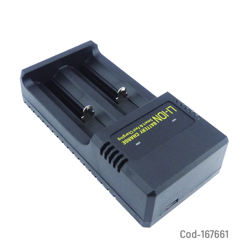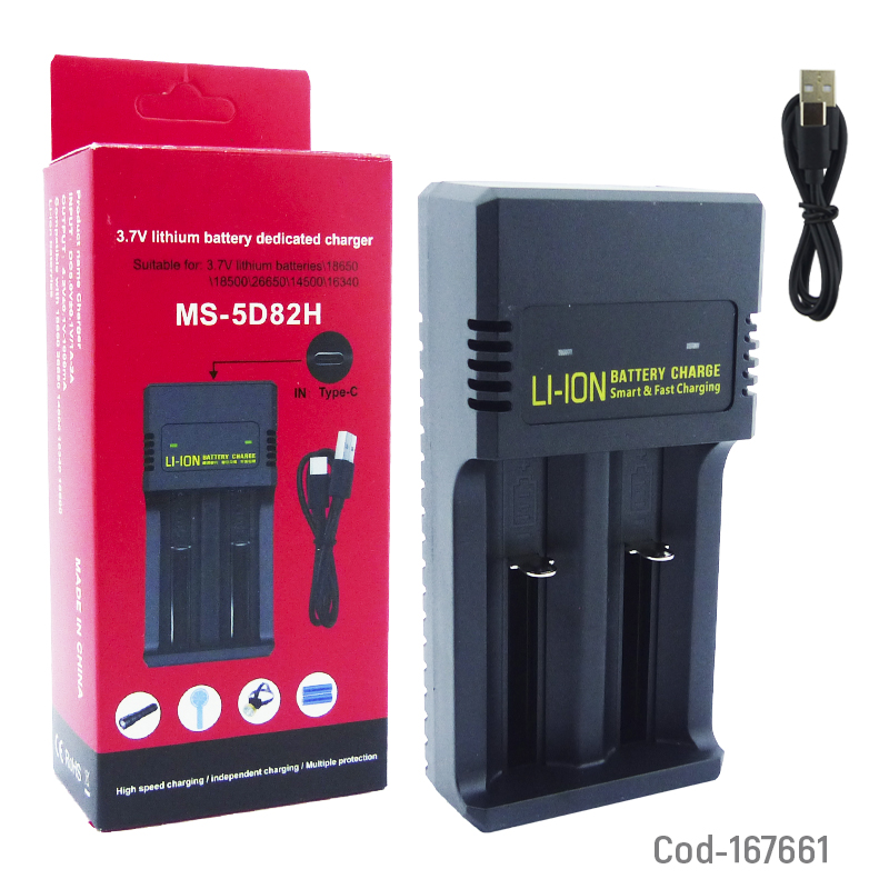 Cargador de pilas doble modelo MS-5D82H, compatible con pilas 18650, 14500, 16340, 26650 y 18500, corriente de carga de 1000 mA, carga segura y eficiente, diseño compacto y práctico, producto presentado en caja.