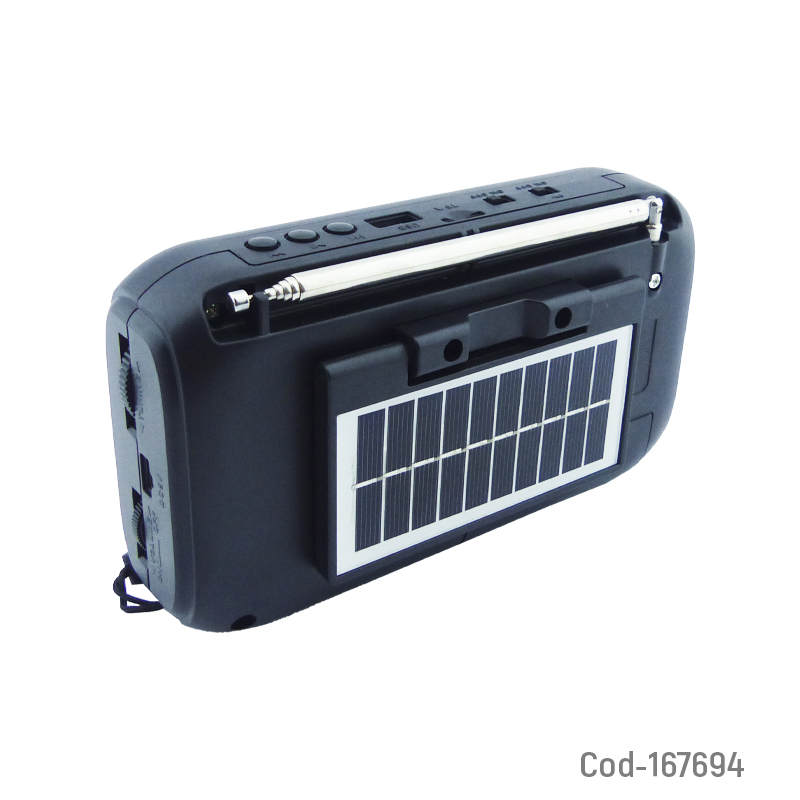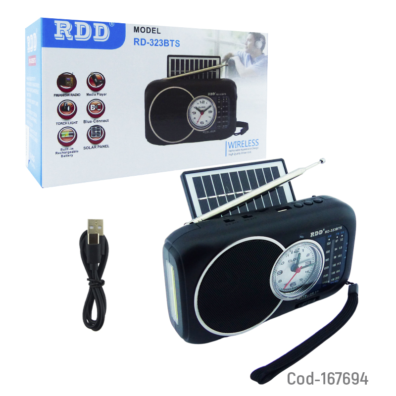 Radio multibanda solar marca RDD, modelo RD-323BTS, conexión Bluetooth integrada, reloj LED COB, entradas USB y TF, radio FM, batería recargable, diseño práctico para uso diario o emergencias, producto presentado en caja.